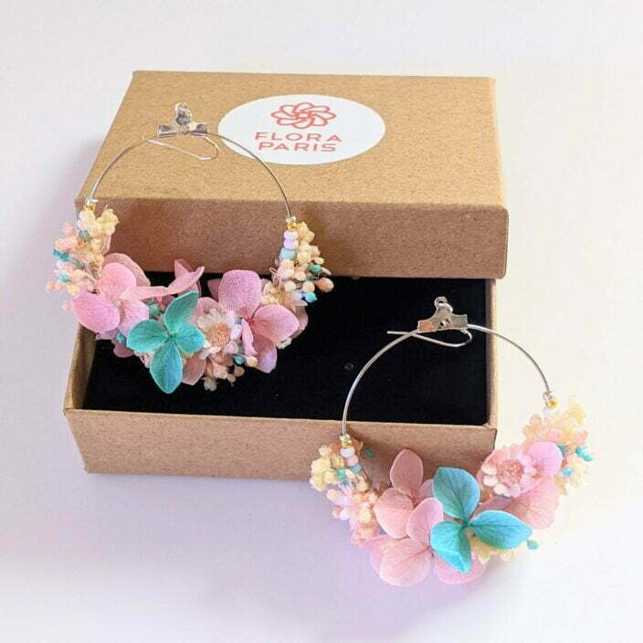 Les boucles d’oreilles Candy sont une création à la fois gourmande et délicate. Elles viendront sublimer vos plus belles tenues de par leur finesse et leurs couleurs pastel : rose bonbon, turquoise, blanc. Elles sont réalisées avec amour et de façon 100% artisanale en atelier. Ce bijou est composé de fleurs stabilisées et fleurs séchées : hortensia, gypsophile mini, broom bloom, glixia. Ces boucles d’oreilles sont montées sur un support et un crochet en acier inoxydable, elles peuvent également être adaptées pour les oreilles non percées.