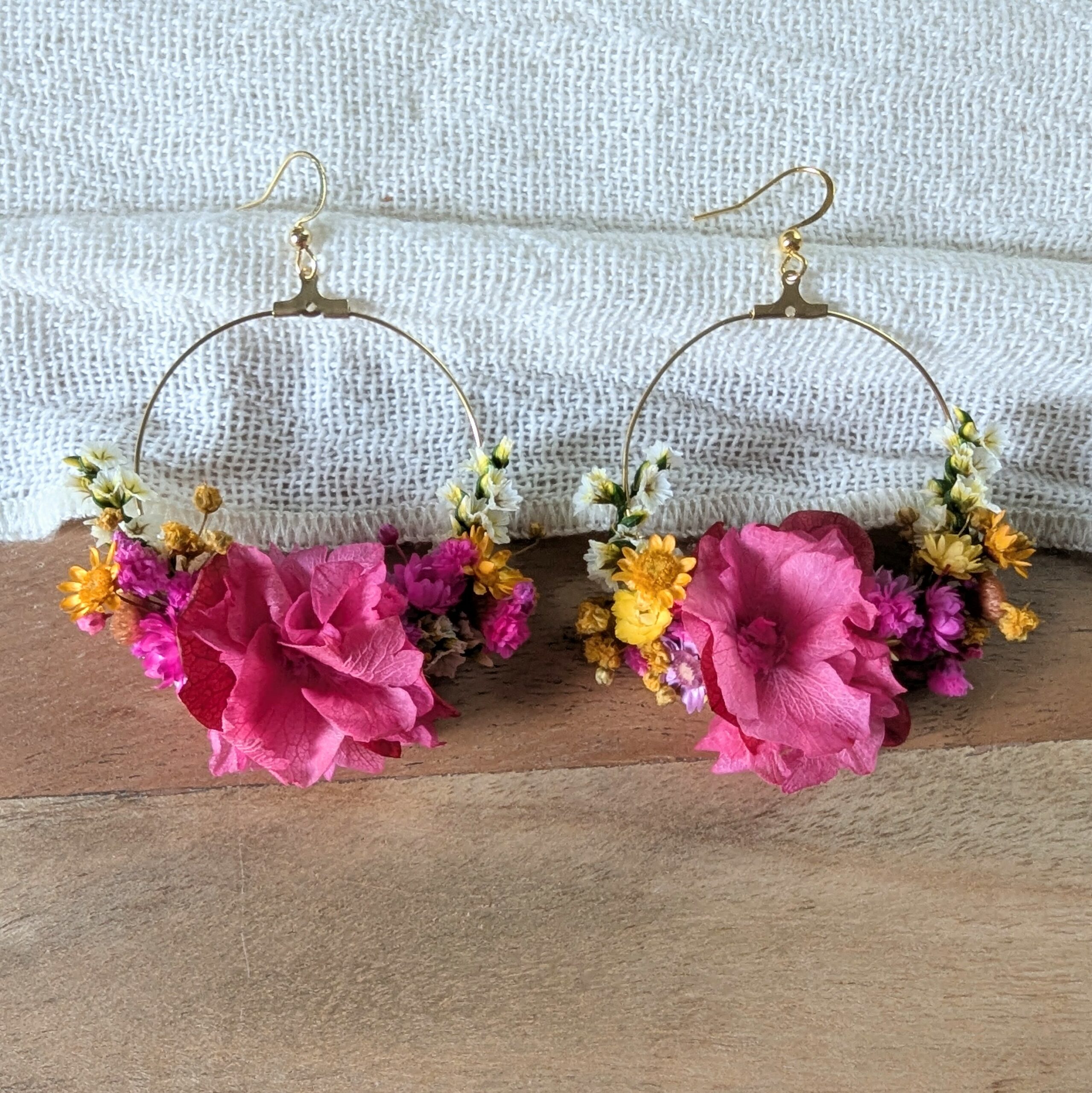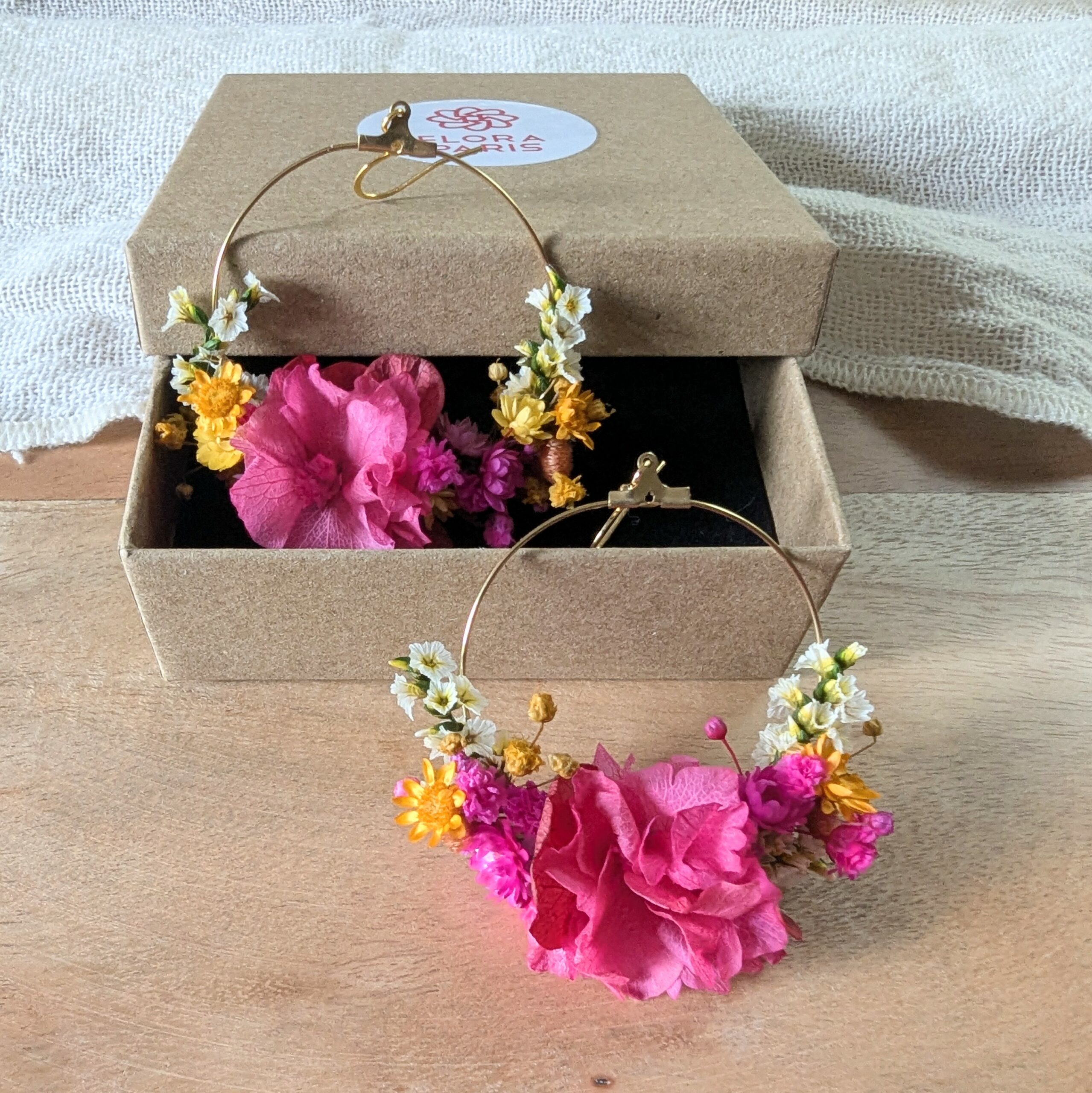 Les boucles d’oreilles fleuries Diane sont une création poétique et lumineuse, imaginée pour sublimer une tenue avec délicatesse. Confectionnées à la main dans mon atelier bordelais, elles associent un anneau en acier inoxydable doré élégant à un assemblage raffiné de fleurs stabilisées et séchées, dans des tons vibrants de rose fuchsia, jaune doré et ivoire. Chaque paire est unique. Les fleurs, soigneusement sélectionnées, apportent légèreté et féminité tout en conservant leur éclat grâce au procédé de stabilisation naturelle. Idéales pour une occasion spéciale, un mariage, une cérémonie ou simplement pour apporter une touche florale et bohème à une tenue du quotidien, ces boucles d’oreilles en fleurs stabilisées sont pensées comme un bijou délicat, durable et chargé d’émotion.