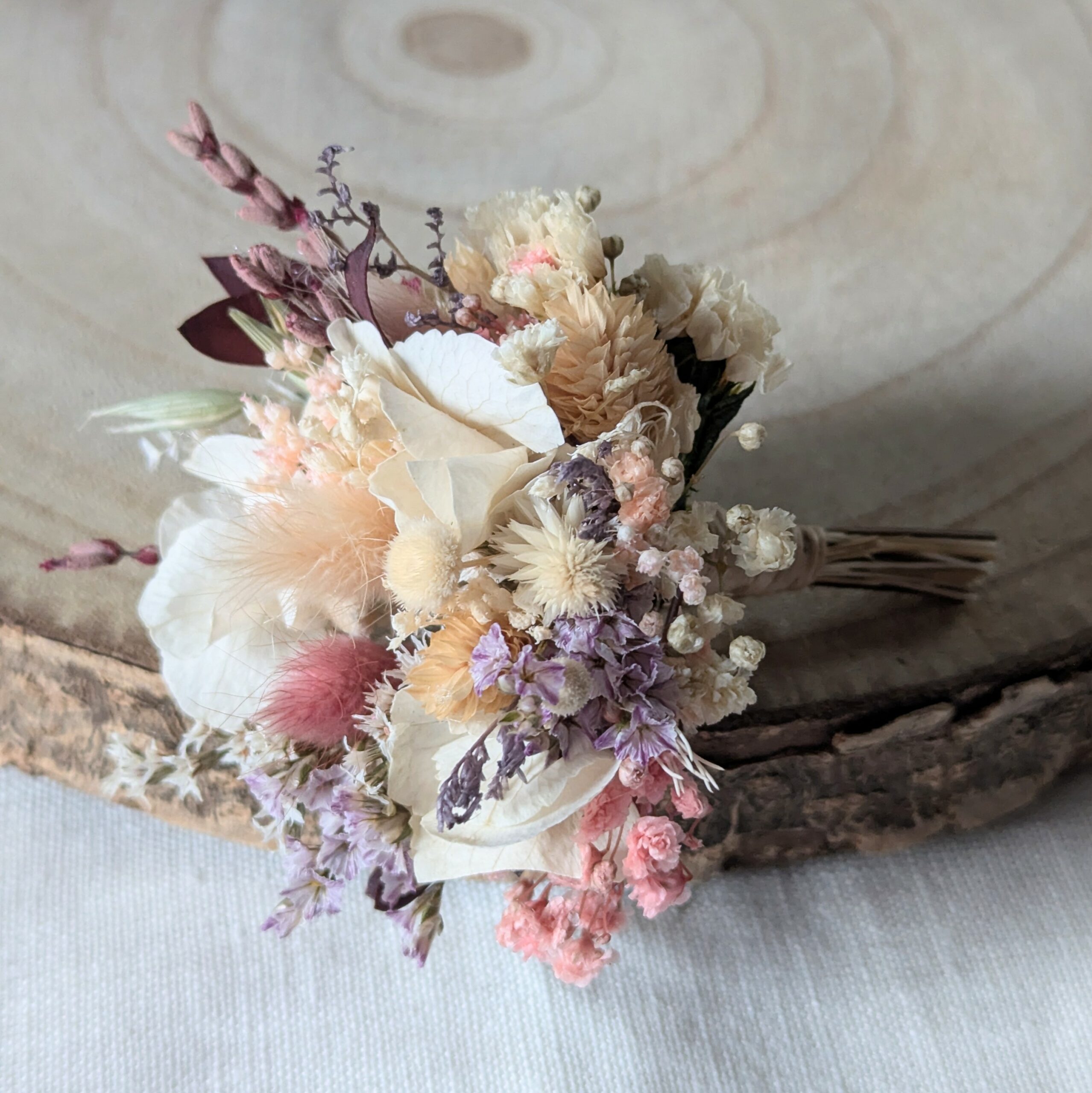 La boutonnière Jessy est une création florale raffinée, imaginée comme le détail élégant qui sublime un costume le jour du mariage. Réalisée à la main à partir de fleurs naturelles séchées et stabilisées, elle se décline dans de délicates tonalités nude, beige et rosé, en parfaite harmonie avec le bouquet Jessy. Chaque fleur est soigneusement sélectionnée et assemblée pour créer une boutonnière à la fois discrète et précieuse, pensée pour le marié, les témoins ou les proches. Grâce au procédé de stabilisation, elle conserve sa beauté bien au-delà du jour J, sans entretien, comme un souvenir intemporel de ce moment unique. Une création artisanale élégante, durable et pleine de sens, pour un mariage naturel, chic et harmonieux.