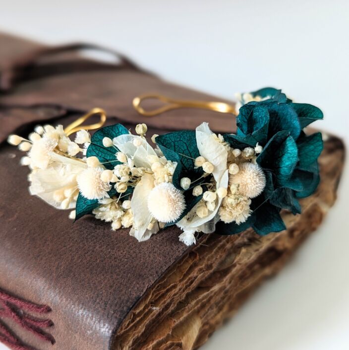 Découvrez le bracelet Malèna en fleurs stabilisées, l’accessoire bohème indispensable pour se démarquer. Avec ses tonalités bleu vert et blanche, Malèna est un véritable bijou pour les mariées chics et leurs témoins. Cet accessoire fleuri raffiné et délicat se conserve dans le temps, composé d’hortensias, de boutons, de gypsophiles et de broom bloom. Exprimez votre style avec les créations florales intemporelles de Flora Paris, elle vous offre toute une gamme d’accessoires en fleurs séchées et stabilisées pour répondre à vos envies et vous accompagner dans vos festivités : mariage, baptême, baby shower, anniversaire.