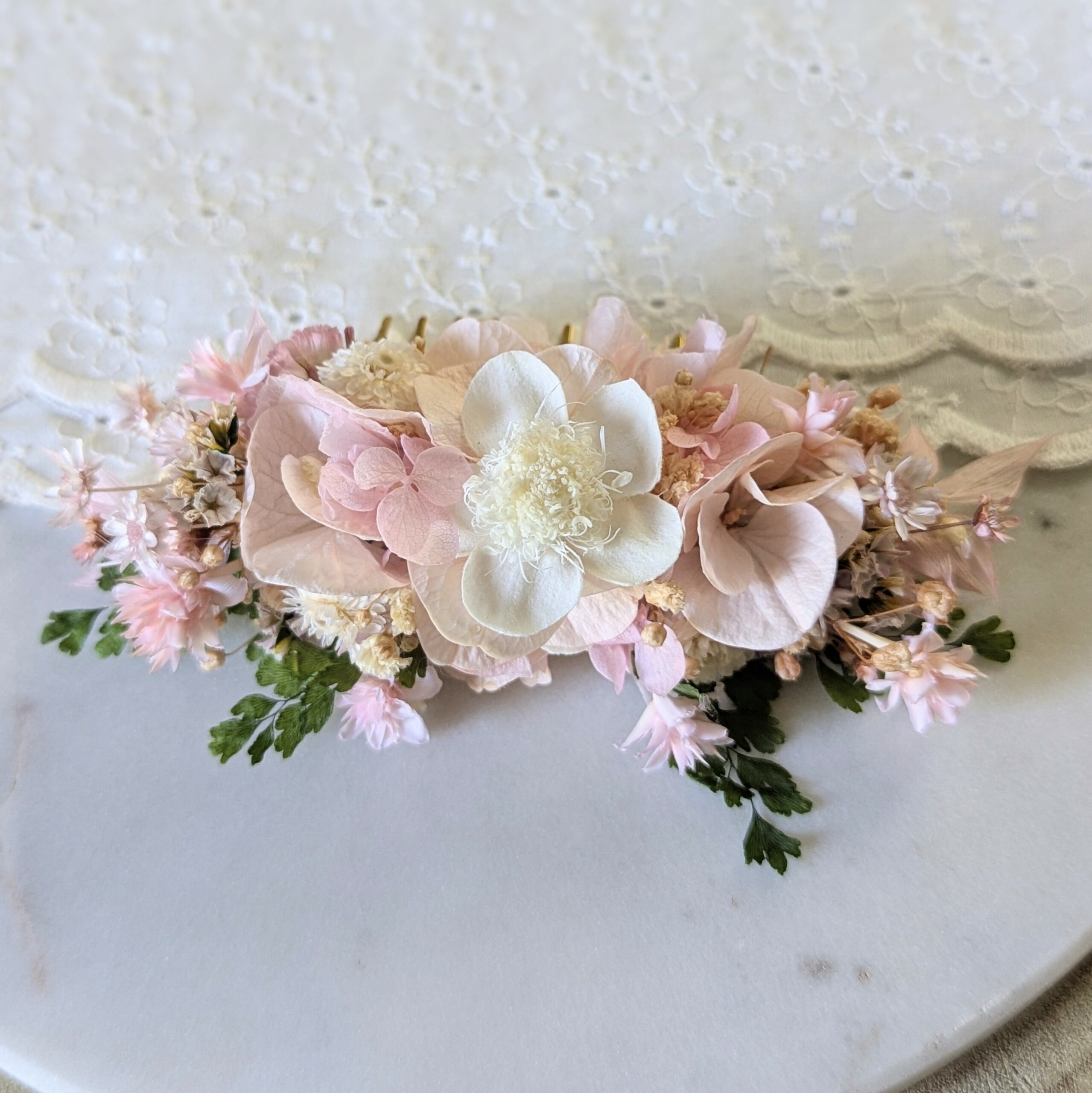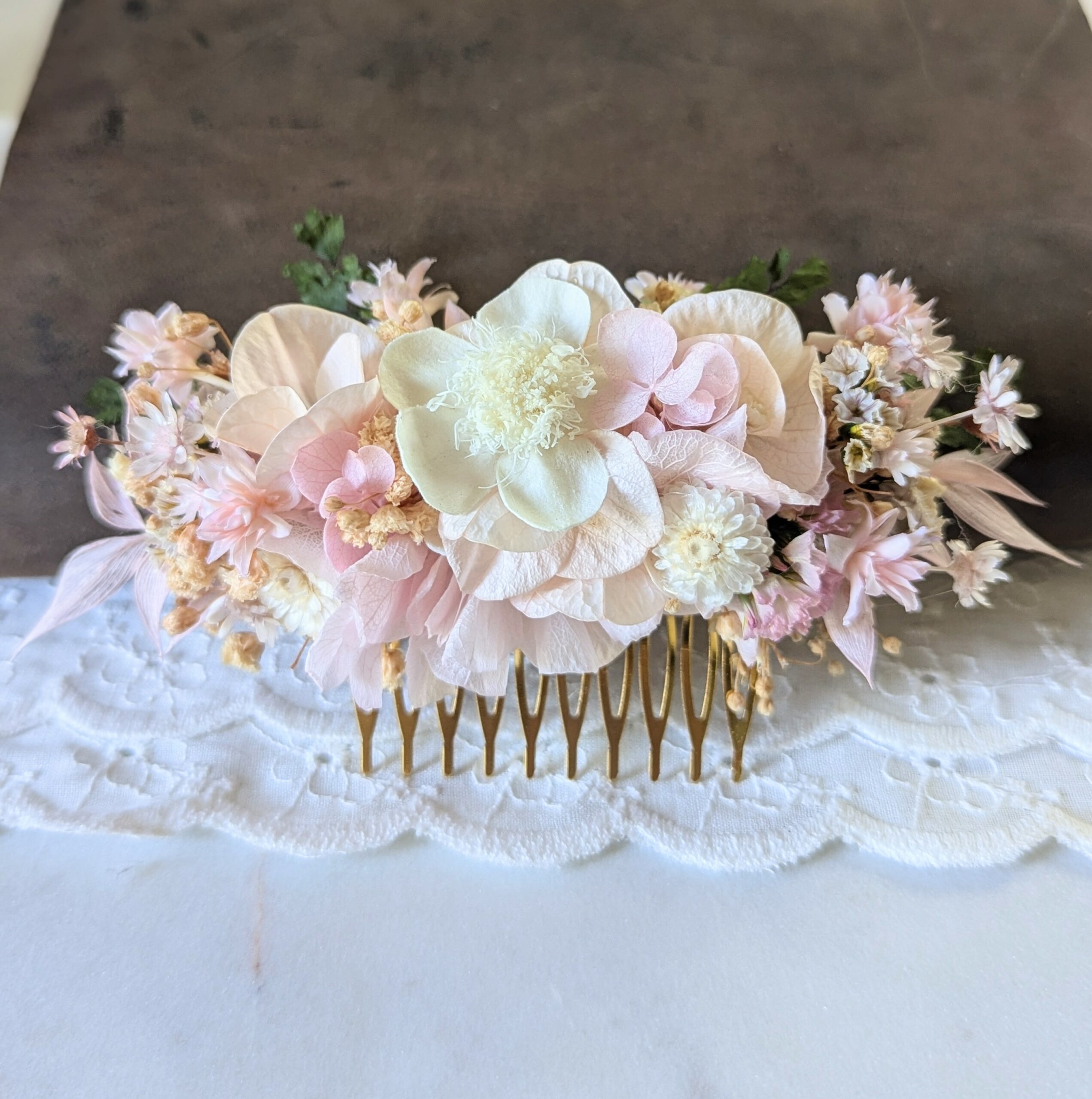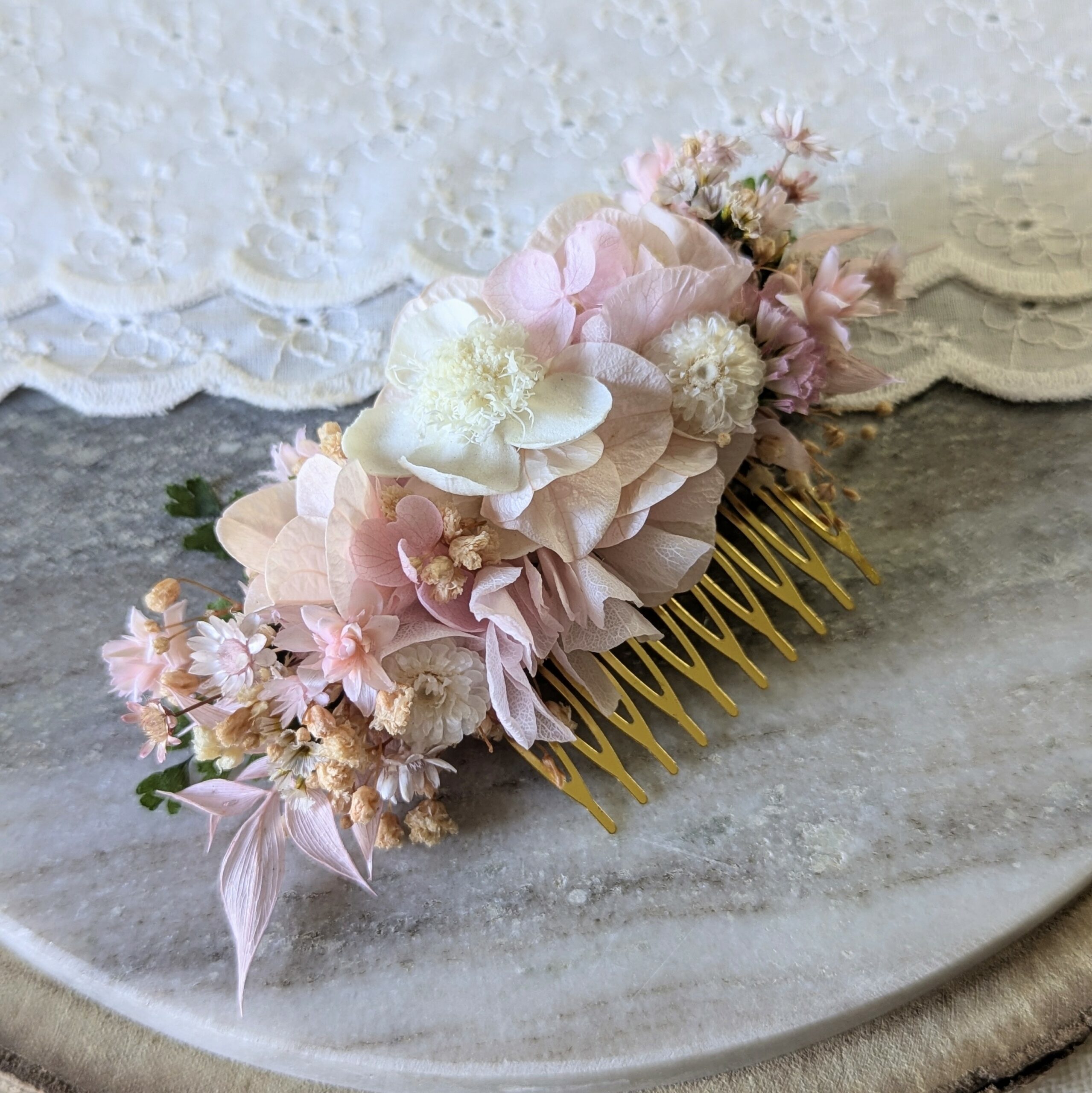 Un peigne nuptial d’une douceur infinie, composé de fleurs stabilisées délicatement assemblées entièrement à la main dans mon atelier bordelais, ce peigne est unique, comme vous. Comme un souffle de printemps posé dans les cheveux, le peigne Emilie est une œuvre florale composée d’hortensias stabilisés rose poudré, de petites fleurs champêtres ivoire et de touches de verdure qui s’entrelacent. Chaque détail est pensé pour accompagner la mariée dans l’un des plus beaux jours de sa vie. Ce peigne à cheveux pour mariée s’adapte à toutes les coiffures : chignon, demi-queue, tresses bohèmes ou cheveux lâchés. Sa structure dorée aux dents fines se glisse facilement dans les cheveux sans les abîmer, pour un port confortable toute la journée.