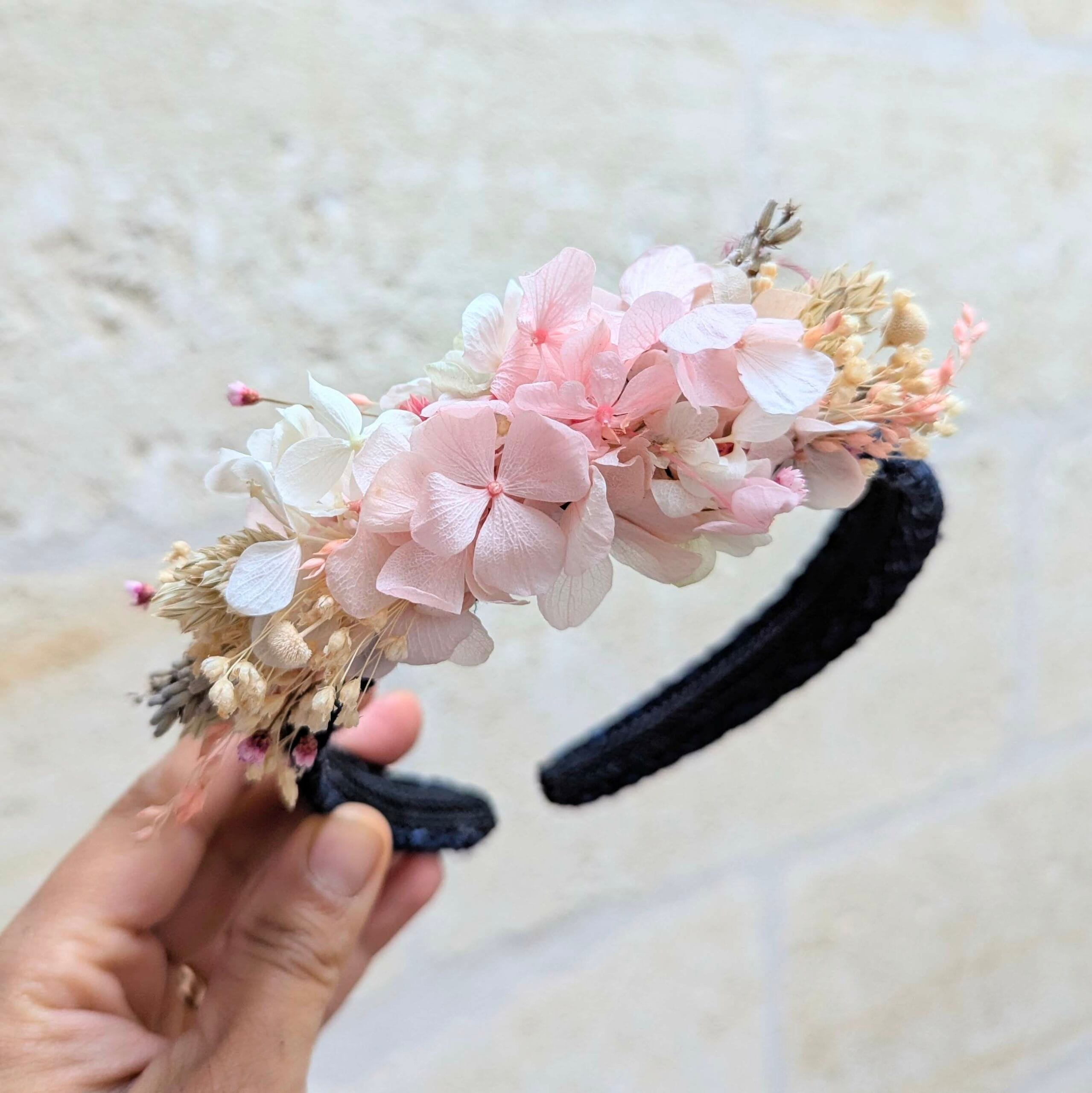 Ajoutez une touche délicate et raffinée à vos coiffures avec ce sublime serre-tête en fleurs séchées et hortensias stabilisés. Réalisé avec soin dans des tons doux de rose poudré, blanc nacré, vert tendre et une touche subtile de gris lavande, ce serre-tête est une pièce unique et élégante. Son design intemporel et romantique en fait l’accessoire parfait pour un mariage bohème, une fête ou simplement pour sublimer une tenue de tous les jours. Chaque fleur a été choisie avec minutie pour garantir une harmonie parfaite entre nature et artisanat. Portez-le pour un style bohème chic ou offrez-le comme cadeau inoubliable.