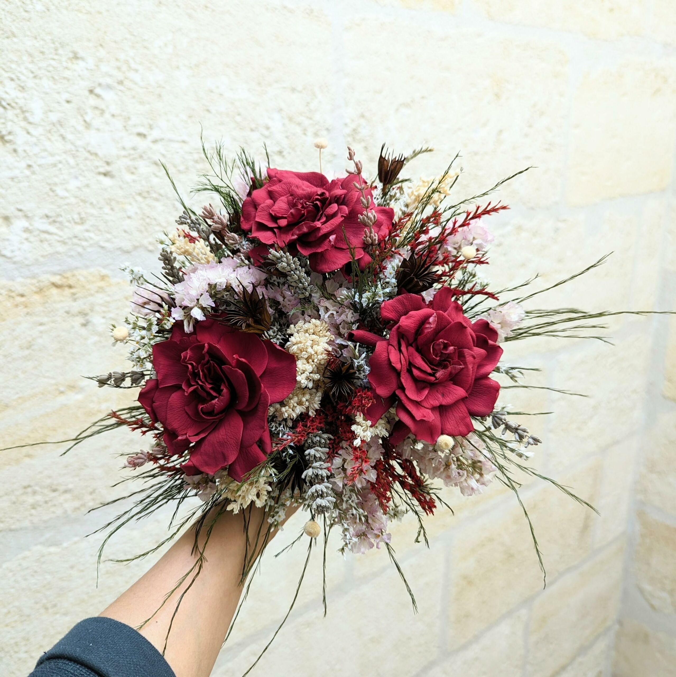 Découvrez le bouquet de mariée Rachel, une symphonie de couleurs rouges, vertes, marrons et roses, composée de fleurs naturelles stabilisées et de fleurs séchées telles que : gardénias, asparagus, lavande, statice, nigelle, boton, junquillo, limonium. Laissez sa splendeur illuminer votre jour de mariage et faire de vous la plus belle des mariées.