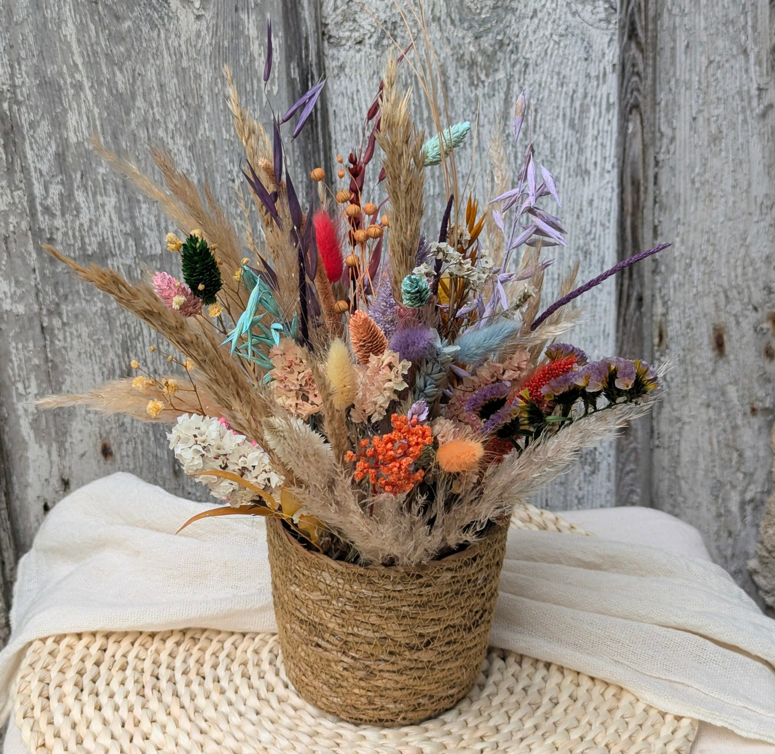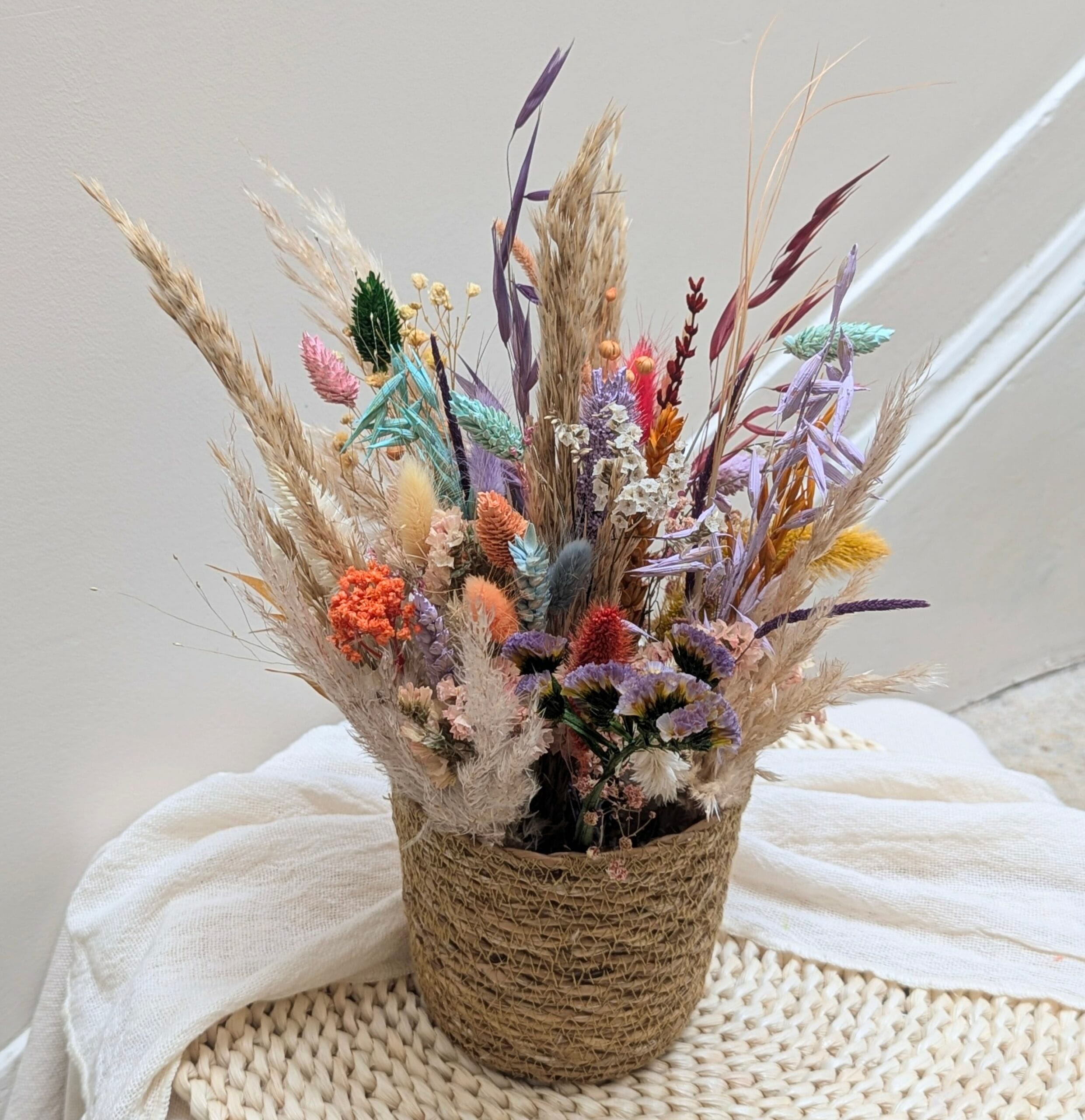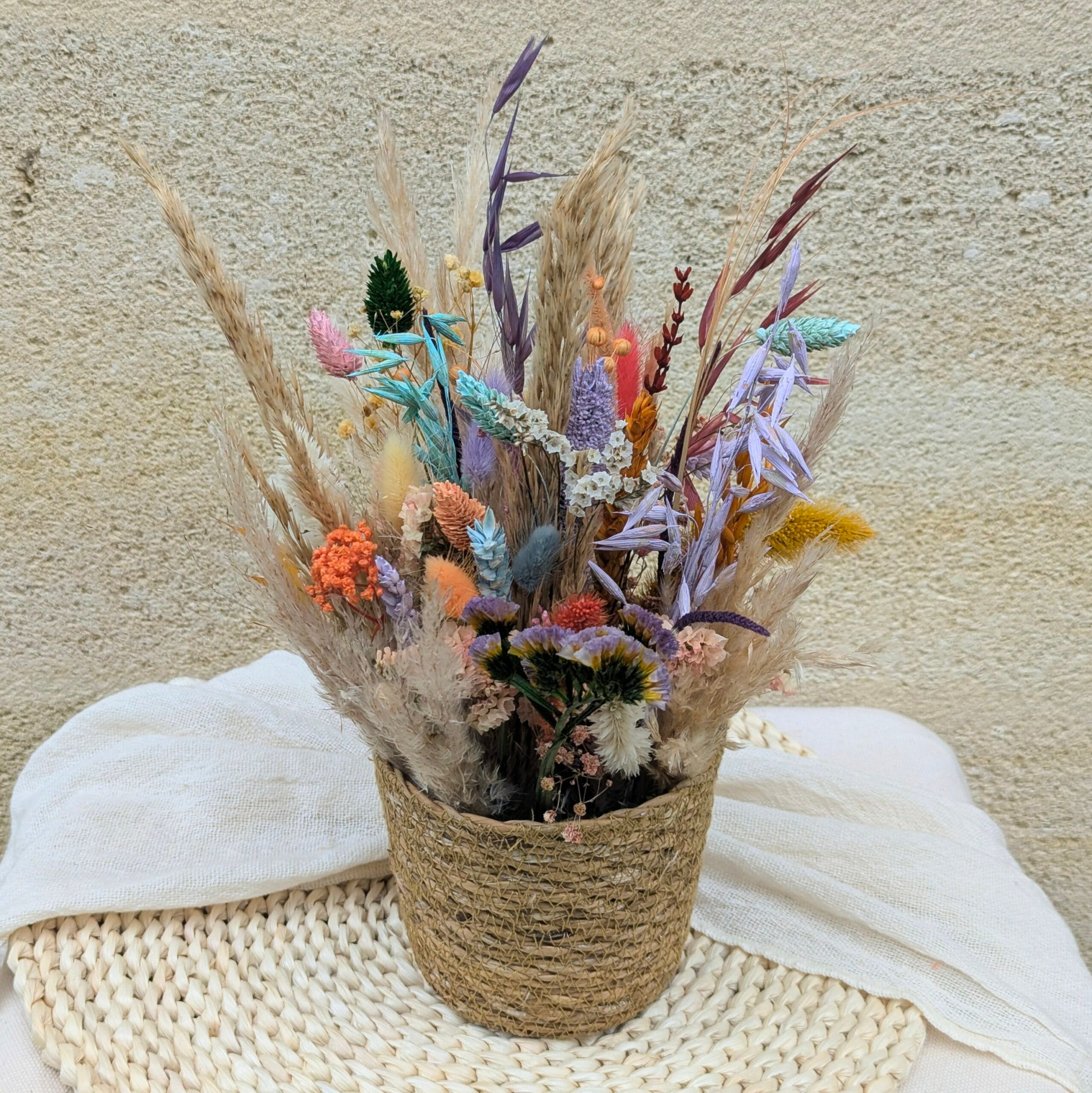 Bloom est une composition florale piquée, mêlant fleurs séchées et stabilisées, aux accents champêtres et colorés. Présentée dans un panier tressé en rotin naturel aux tons marron clair, elle apporte instantanément chaleur et convivialité à votre intérieur. Composée de pampas, ruscus, blé, avoine, statice, sétaire, gypsophile, phalaris, lagurus, broom bloom et limonium, cette création se distingue par la richesse de ses textures et la vivacité de ses teintes. Chaque pièce est réalisée avec soin, pour sublimer un espace de vie, un bureau, une étagère ou une cheminée. Bloom est aussi une idée cadeau durable et élégante, parfaite pour célébrer une occasion ou simplement faire plaisir.